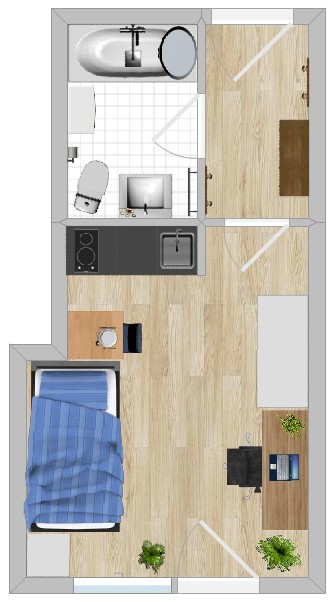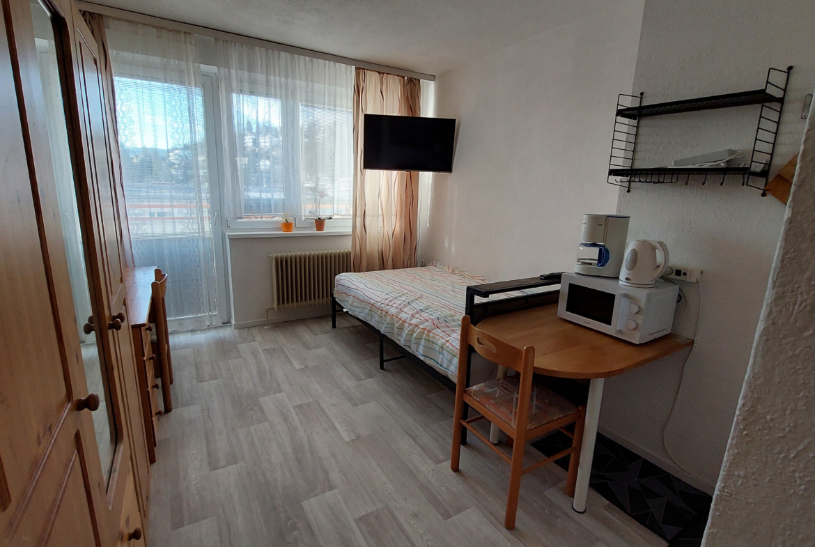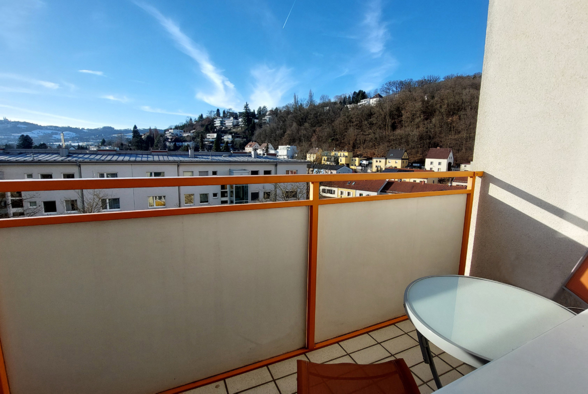 Dieses kompakte und gut geschnittene Studio ist voll möbliert und bietet alles, was man für ein komfortables Studentenleben braucht. Der Wohn-Schlafraum ist mit einem praktischen Küchenblock inklusive Geschirr und Heißluftbackofen, einem 1,20 m-Bett, Kasten, Schreibtisch sowie einem TV mit Fire-Stick (Streaming-Abos nicht inkludiert) ausgestattet. Vom eigenen Balkon aus genießt man einen schönen Blick auf den Pöstlingberg.